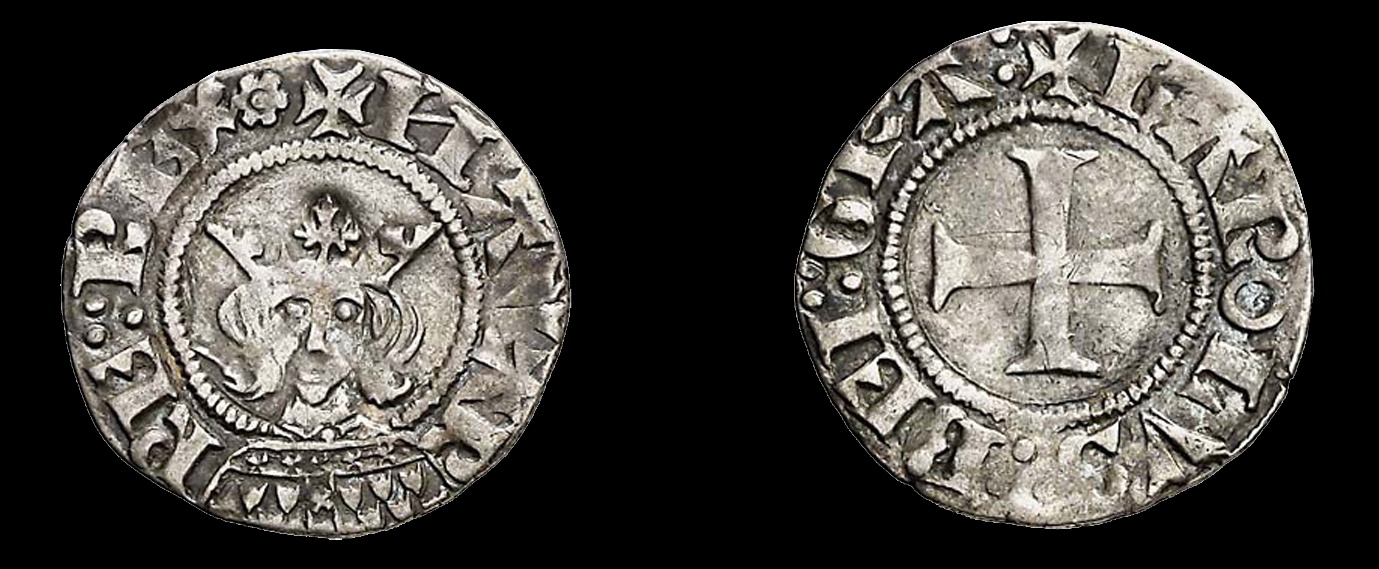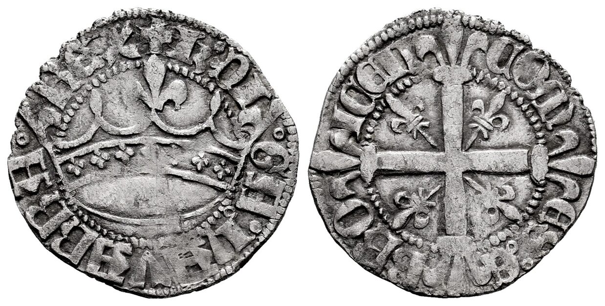 Karlos III. (1387-1425) eta again Karlos II.aren (1350-1387) Nafarroako erregeen garaian landutako biloiezko karlin txuria – 1,00 gr, 19,5 mm Diametroa
