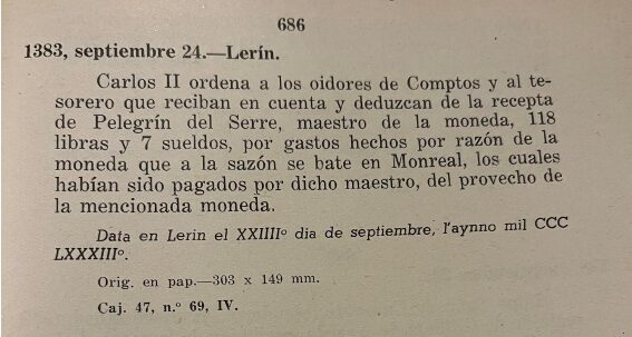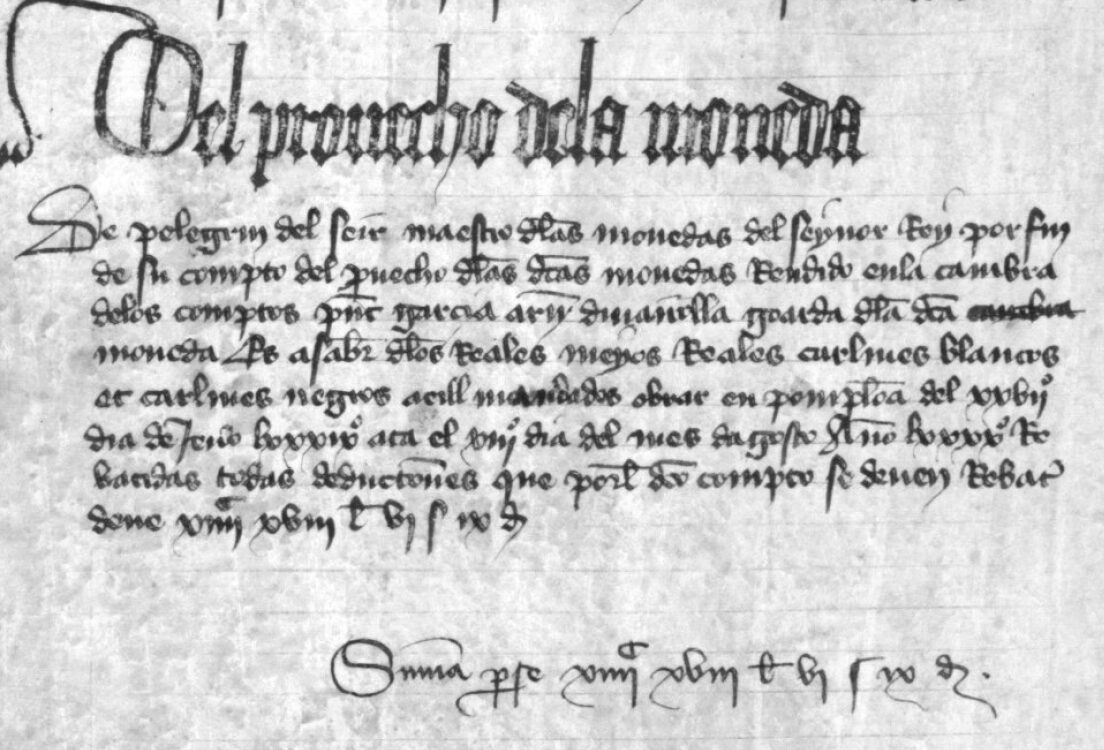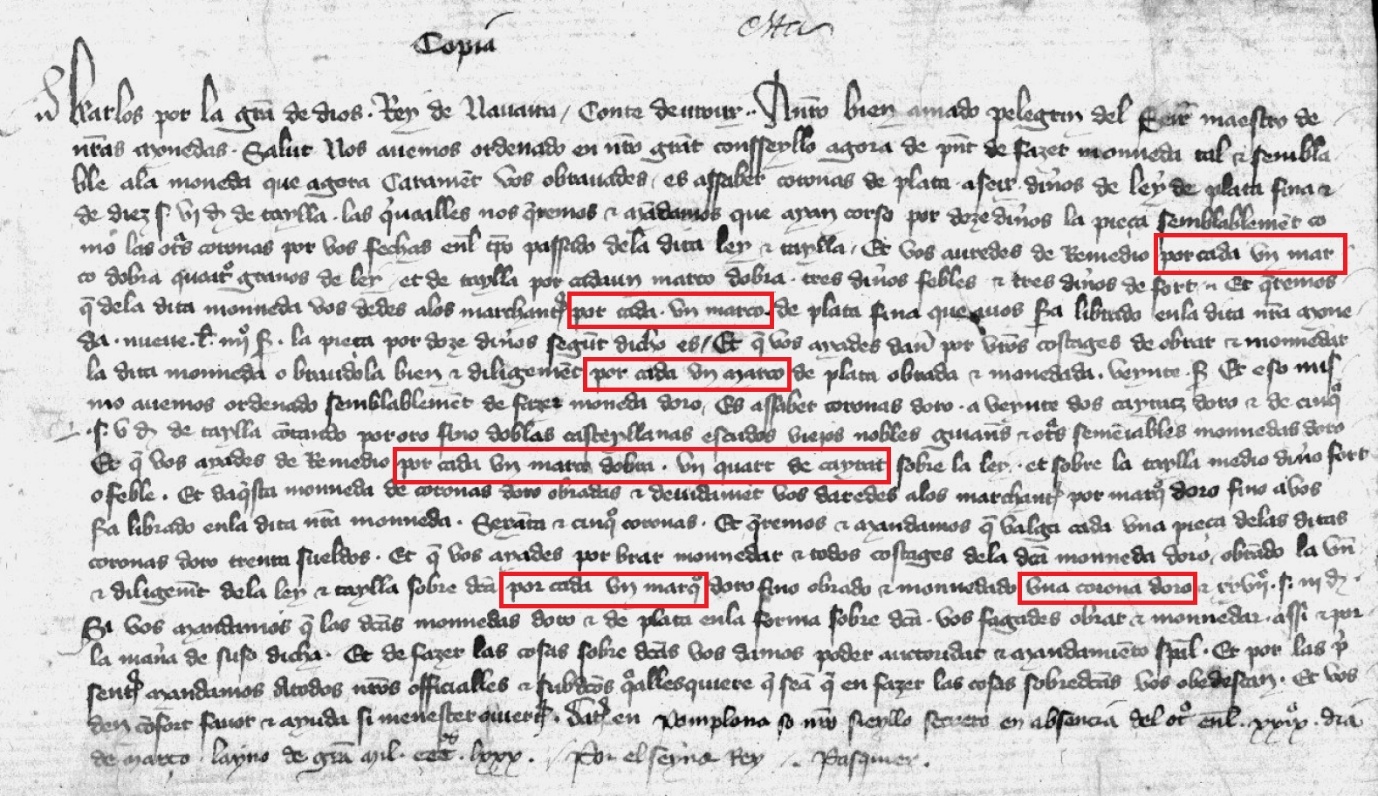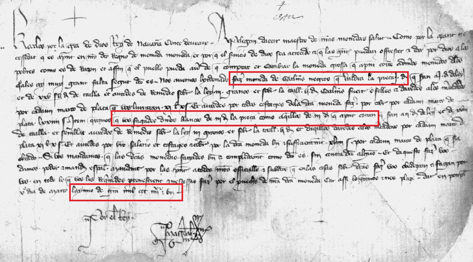 Karlos por la gra de Dios Rey de Navarra Comte devreux, antro bien amado Pelegrin del Serr maestro de ntras monedas salut. Necessario es por provecho comun de ntro reyno de hacer moneda menuda porque de aquella moneda a present ha gran falta et sus aquesto avemos ordenado que bos fagades fazer carlines prietos de bun dinero la pieza y beynte y cinquo sueldos por marco de taila y aXII granos deley cascun marco de obra. Et por aquesta como saldran de marco d’argent fino treynta libras. Et queremos que bos ayades de remedio sus la tailla por cadabun marco de obra VI dineros Fuertes o febles sus la ley por marco dobra tres granos. Et daquesta moneda bos dares merchantes por marco dargent fino quince libras y diez sueldos. Et aobreros por marco dobra II sueldos VI dineros. Amonederos por marco de obra XII dineros. Gravador y ensay por marco de obra VI diners. Dla goarda por marco dobra IIII diners. YRM por lo cobre Setanta Sueldos. YRL al maestre por dechays fondiro oli piedras y todas otras despensas treynta y seys Sueldos. Assin de movan de provecho al sennyor Rey por marco d’argent fino quatro libras.