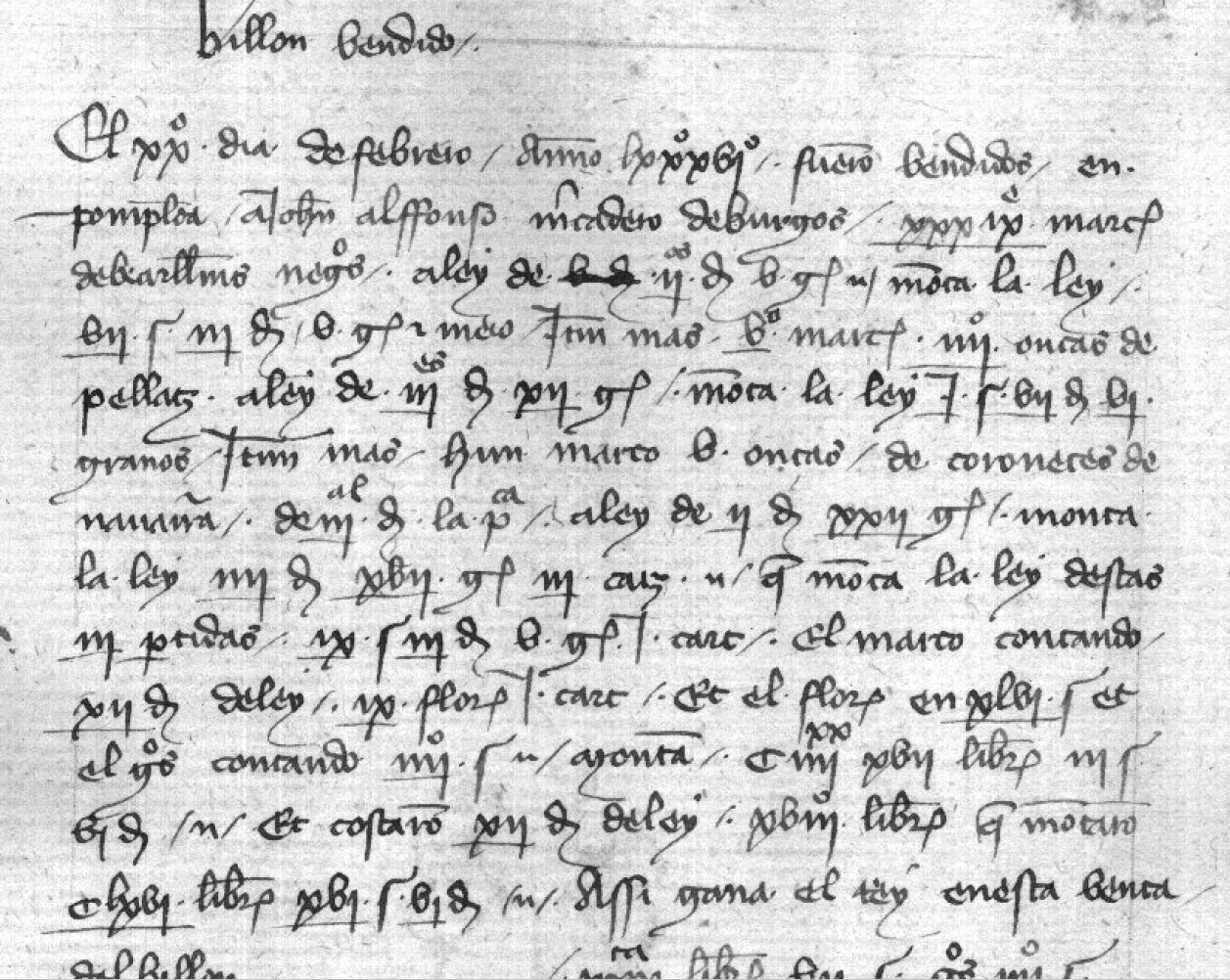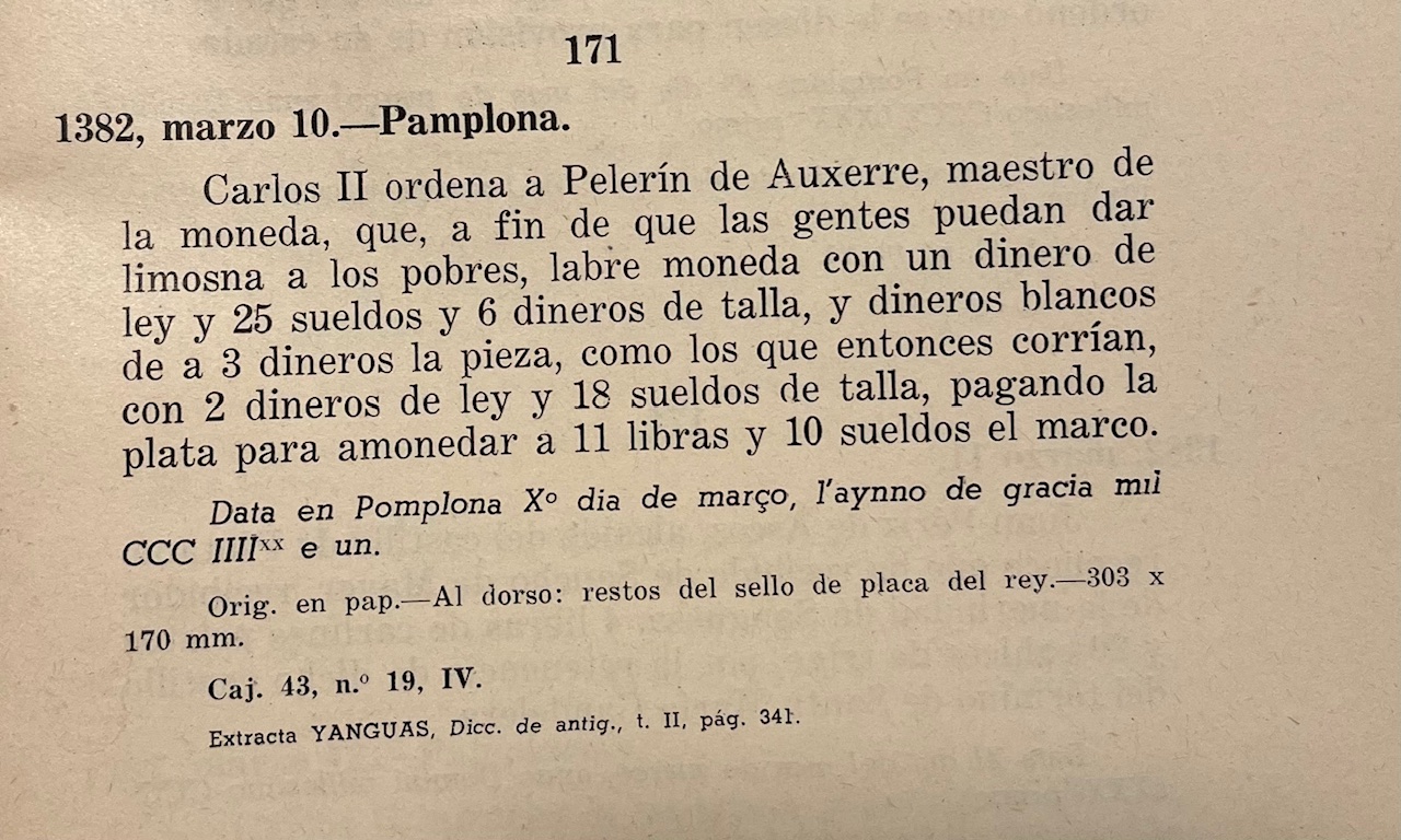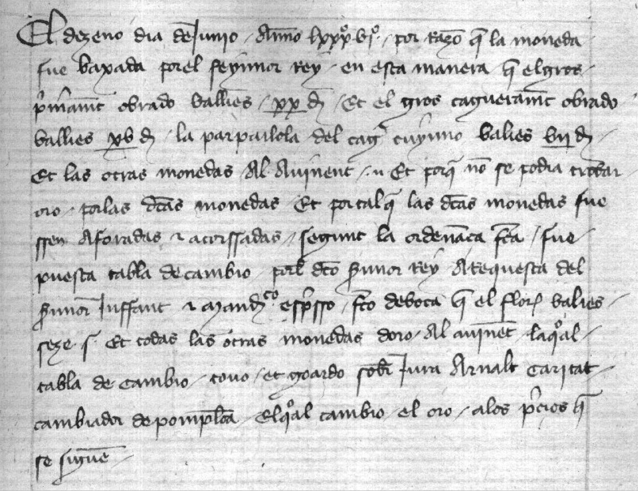 Karlos por la gra de Dios Rey de Navarra Comte devreux, antro bien amado Pelegrin del Serr maestro de ntras monedas salut. Necessario es por provecho comun de ntro reyno de hacer moneda menuda porque de aquella moneda a present ha gran falta et sus aquesto avemos ordenado que bos fagades fazer carlines prietos de bun dinero la pieza y beynte y cinquo sueldos por marco de taila y aXII granos deley cascun marco de obra. Et por aquesta como saldran de marco d’argent fino treynta libras. Et queremos que bos ayades de remedio sus la tailla por cadabun marco de obra VI dineros Fuertes o febles sus la ley por marco dobra tres granos. Et daquesta moneda bos dares merchantes por marco dargent fino quince libras y diez sueldos. Et aobreros por marco dobra II sueldos VI dineros. Amonederos por marco de obra XII dineros. Gravador y ensay por marco de obra VI diners. Dla goarda por marco dobra IIII diners. YRM por lo cobre Setanta Sueldos. YRL al maestre por dechays fondiro oli piedras y todas otras despensas treynta y seys Sueldos. Assin de movan de provecho al sennyor Rey por marco d’argent fino quatro libras.