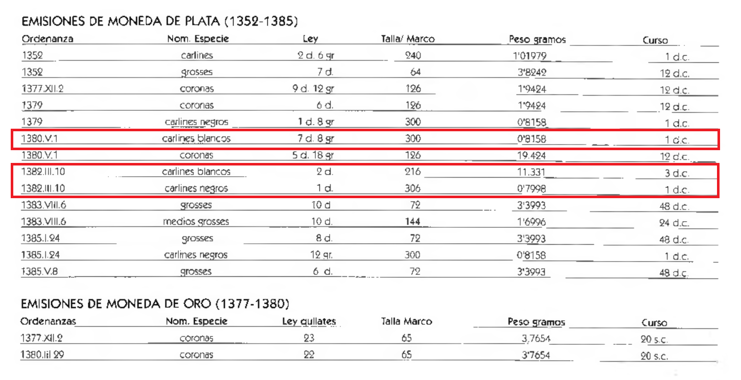 Ziurrenik, lehen lanketako koronetek bigarren lanketakoek baino zilar eduki handiagoa zuten. Burgosko merkatariaren pasarteak erakutsitako zilar edukia 1380. urteko martxoan agindutako zilarrezko koroa oso eta hurrengo maiatzean agindutako karlin beltzaren beherapenarekin lerrokatuko litzateke. Pasarte horrek, bigarren lanketa garaiko koroneta aleen ezaugarriak emango lizkiguke.