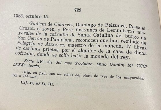 Non landu ote ziren urrezko eta zilarrezko koroa bezala ezagunak diren garai honetako aleak? Erantzuna A.G.N. Caj 47 N°54, III dokumentuak ematen digu; 1377 eta 1382 urteen arteko txanpongintzak, Santa Katalina kofradiak San Zernin burgoan zuen etxean landu ziren.