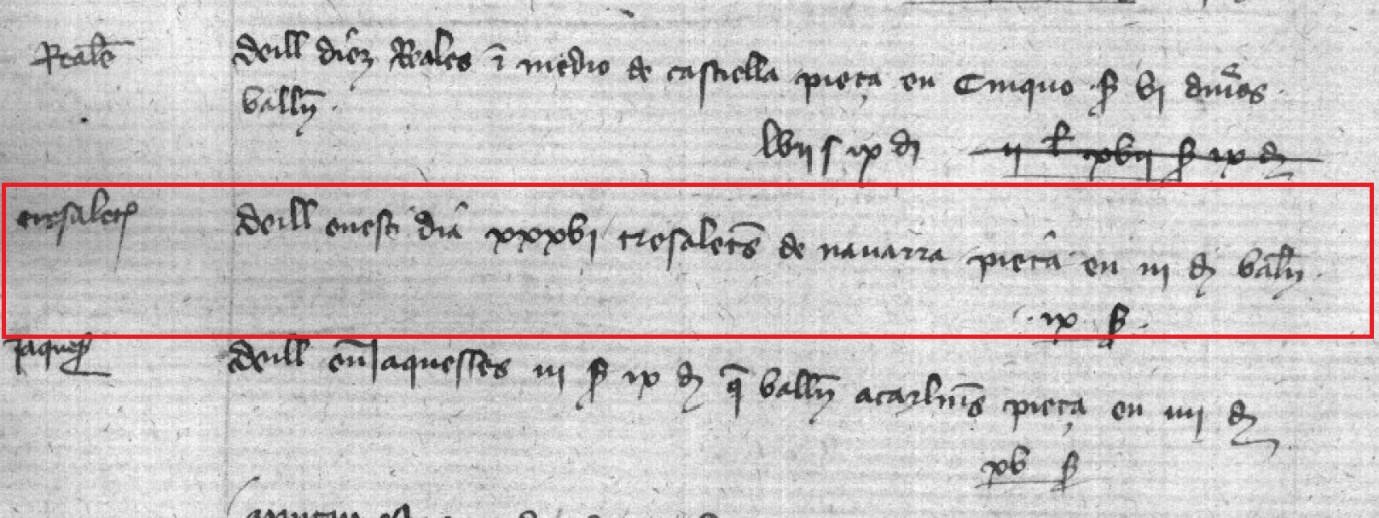 ntro dcho regno de menuda moneda et por q el ßmas de dios sea recreado y que los que puedan ofrecer y dar por dios a los pobres Como es de razon et assin que el Pueblo pueda asi de q comprar et cambiar la moneda grosa q a present corra adonde menudos de quales ay muy gran falta segun dcho es. Nos havemos hordenado facer moneda de carlines negros q valdra la pieza 1 dineros y que son a 1 diner de ley et de XXV sueldos VI diners de tailla et auredem de remedio sobre la ley III granos et sobre la talla VI diners carlines fuertes o febles e daredes a los mercaderes por cadaun Marco de plata q nos livraran XI libras X sueldos. Et auredes por todos costages dla dcha moneda fecha por cobr por cadaun Marco de plata LXXIIII Sueldos. Idem queremos que vos fagares dineros Blancos de III dineros la pieza Como aquellos de III dineros q a present corren q sean a II dineros de ley et de XVIII de tailla et semblat auredes de remedio sobre la ley III granos et sobre la talla VI diners et daquellos daredes a los mercaderes por cadaun Marco de plata XI libras X sueldos. Et aurades por vtro salario et costages recibir por la dcha por la dca moneda bien suficientemente XLIIII sueldos por cadaun Marco de plata que va obrado. Si vos mandamos q las dchas monedas fagades bien y complidame Como dcho es sin contradicho alguno. Et daquesta faz vos damos poder y mandamiento especial. Cuydanse por las prtes a todos ntros oficiales y subditos q en las Cosas sobre dchas faz vos obedezcan y fagan por vos en todo lo que vos les requeredes prenesement y necessario fazer por el provecho de ntra dcha moneda car asi lo queremos y nos place dar en Pamplona X dia de Marzo del anyo de gra mil CCC IIIIXX vun Pierres Magdalena