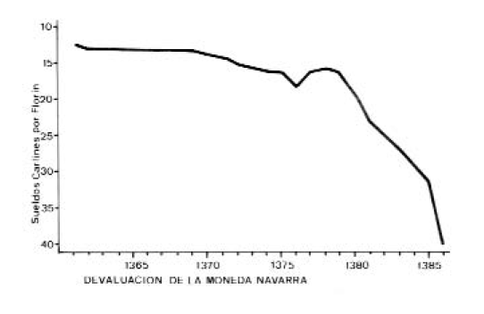 Egiazki, nafar moneta sistemak beherapenezko garapen sakona izan zuen eta lehen aipatutako adituek ederki deskribatu izan ohi dute garapen hori; 1380. urtetik aurrera eta hurrengo sei urteetan zehar, urrezko txanponen eta txanponketetarako erositako zilarraren prezioek erabateko gorakada azkarra izan zuten, inflazio fenomeno bezala izendatua.